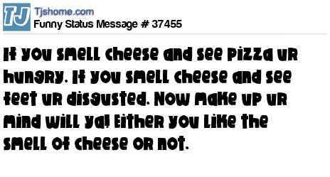 X If you smell cheese and see pizza ur hungry. If you smell cheese and see feet ur disgusted. Now make up ur mind will ya! Either you like the smell of cheese or not.