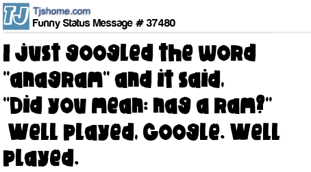 X I just googled the word ''anagram'' and it said, ''Did you mean: nag a ram?'' Well played, Google. Well played.