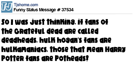 X is So I was just thinking, if fans of the Grateful dead are called deadheads, hulk hogan's fans are hulkamaniacs, those that mean Harry Potter fans are Potheads?