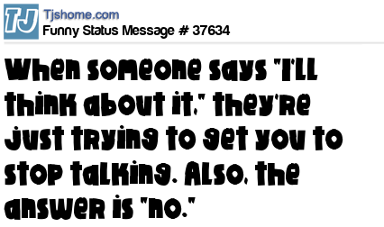 X When someone says "I'll think about it," they're just trying to get you to stop talking. Also, the answer is "no."