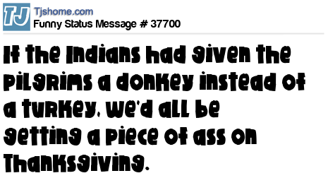 - # 80609 If only the Indians had given the Pilgrims donkey on Thanksgiving. We'd all be getting some ass today.