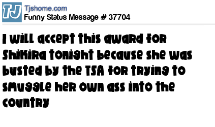 X is I will accept this award for Shikira tonight because she was busted by the TSA for trying to smuggle her own ass into the country