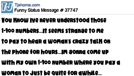 X says You know Ive never understood those 1-900 numbers...It seems strange to me to pay to hear a woman's crazy talk on the phone for hours...Im gonna come up with my own 1-900 number where you pay a woman to just be quite for awhile...