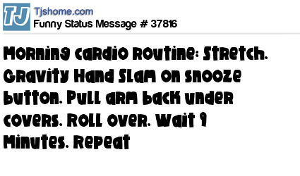 X Morning cardio routine: Stretch. Gravity Hand Slam on snooze button. Pull arm back under covers. Roll over. Wait 9 Minutes. Repeat