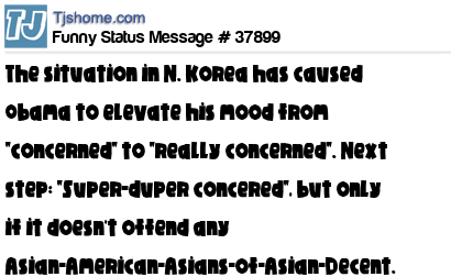 X The situation in N. Korea has caused 0bama to elevate his mood from "concerned" to "really concerned". Next step: "Super-duper concered", but only if it doesn't offend any Asian-American-Asians-of-Asian-Decent.