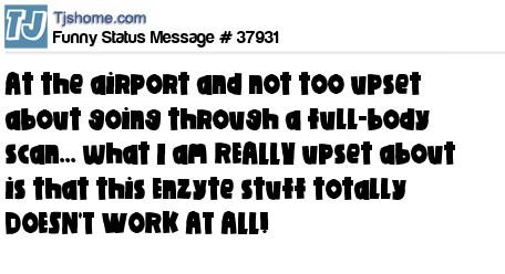 X is at the airport and not too upset about going through a full-body scan... what I am REALLY upset about is that this Enzyte stuff totally DOESN'T WORK AT ALL!