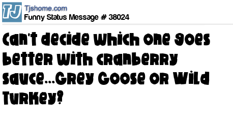 X is can't decide which one goes better with cranberry sauce...Grey Goose or Wild Turkey?