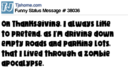 X is On Thanksgiving, I always like to pretend, as I'm driving down empty roads and parking lots, that I lived through a zombie apocalypse.