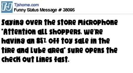 X is Saying over the store microphone "Attention all shoppers, we're having an 85% off toy sale in the tire and lube area" sure opens the check out lines fast.