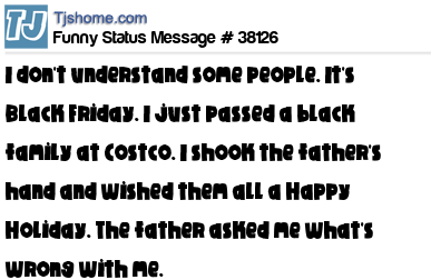 X is I don't understand some people. It's Black Friday. I just passed a black family at Costco. I shook the father's hand and wished them all a Happy Holiday. The father asked me what's wrong with me.