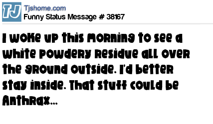 X is I woke up this morning to see a white powdery residue all over the ground outside. I'd better stay inside. That stuff could be Anthrax...