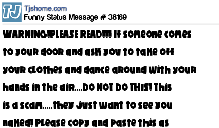 X WARNING!PLEASE READ!!! If someone comes to your door and ask you to take off your clothes and dance around with your hands in the air....DO NOT DO THIS! This is a scam.....they just want to see you naked! Please copy and paste this as your status! I wish