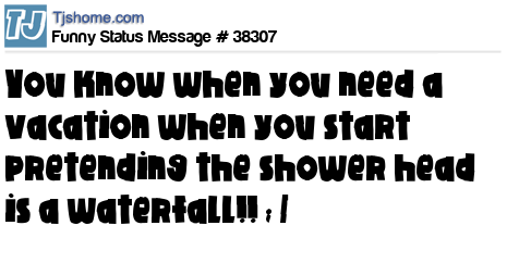 X says You know when you need a vacation when you start pretending the shower head is a waterfall!! ; /