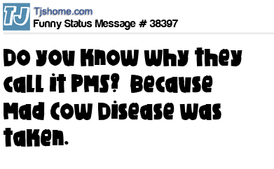 - # 161922 "Do you know why they call it 'PMS'? Because 'Mad Cow Disease' was already taken."