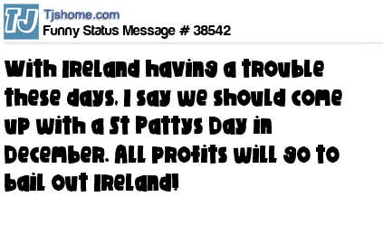 X says With Ireland having a trouble these days, I say we should come up with a St Pattys Day in December. All profits will go to bail out Ireland!