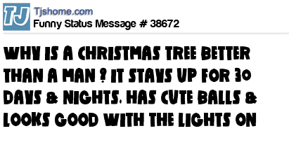 X is WHY IS A CHRISTMAS TREE BETTER THAN A MAN ? IT STAYS UP FOR 30 DAYS & NIGHTS, HAS CUTE BALLS & LOOKS GOOD WITH THE LIGHTS ON