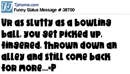 X says Ur as slutty as a bowling ball, you get picked up, fingered, thrown down an alley and still come back for more...=P