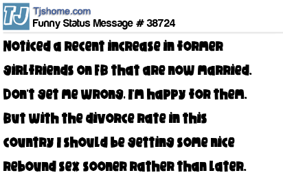 X says noticed a recent increase in former girlfriends on FB that are now married. Don't get me wrong, I'm happy for them. But with the divorce rate in this country I should be getting some nice rebound sex sooner rather than later.
