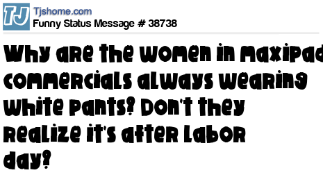 X Why are the women in maxipad commercials always wearing white pants? Don't they realize it's after labor day?