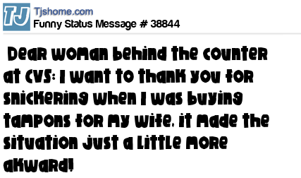 - # 38848 Dear woman behind the counter at CVS: I want to thank you for snickering when I was buying tampons for my wife, it made the situation just a little more awkward!