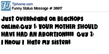 X Just Overheard on BlackOps online;Guy 1: YOUR MOTHER SHOULD HAVE HAD AN ABORTION!!!! Guy 2: I know I Hate my sister!