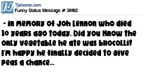 X - in memory of Joh Lennon who died 30 years ago today. Did you know the only vegetable he ate was brocolli? I'm happy he finally decided to give peas a chance...