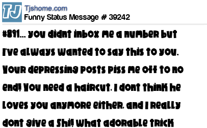 X is #891... you didnt inbox me a number but I've always wanted to say this to you. Your depressing posts piss me off to no end! You need a haircut, I dont think he loves you anymore either, and I really dont give a Shi! what adorable trick your cat did today!