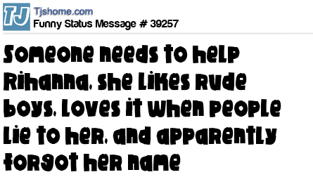 - # 40812 Someone should help Rihanna. She likes rude boys, loves being lied to, thinks she's the only girl in the world & has forgotten her name