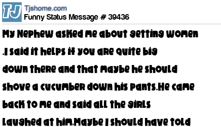 X My Nephew asked me about getting women .I said it helps if you are quite big down there and that maybe he should shove a cucumber down his pants.He came back to me and said all the girls laughed at him,Maybe I should have told him to put it in the front.
