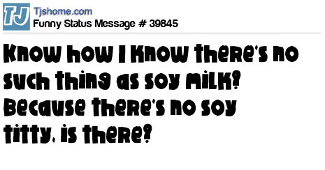X Know how I know there's no such thing as soy milk? Because there's no soy titty, is there?