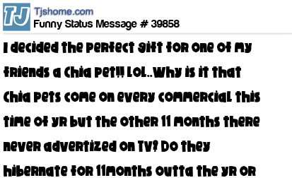 X is I decided the perfect gift for one of my friends a Chia pet!! lol..Why is it that Chia pets come on every commercial this time of yr but the other 11 months there never advertized on TV? Do they hibernate for 11months outta the yr or something?!?!?! Cha-c