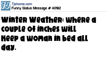 - # 12050 Snow: where a couple of inches will keep a woman in bed all day.