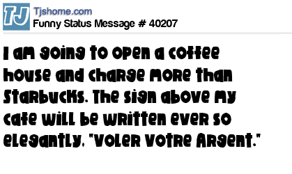 X I am going to open a coffee house and charge more than Starbucks. The sign above my cafe will be written ever so elegantly, "Voler Votre Argent."