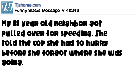 X My 83 year old neighbor got pulled over for speeding. She told the cop she had to hurry before she forgot where she was going.