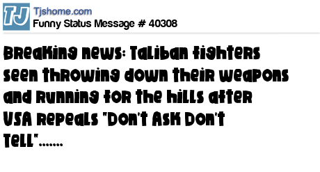 X says Breaking news: Taliban fighters seen throwing down their weapons and running for the hills after USA repeals "Don't Ask Don't Tell".......