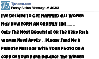 X says I've Decided To Get MARRIED :All Women May Now FORM AN ORDERLY LINE...... .. Only The Most Beautiful Or The Very Rich Women Need Apply . . Please Send Me A Private Message With Your Photo or A copy Of Your Bank Balance ,The Winner Will Notified By email