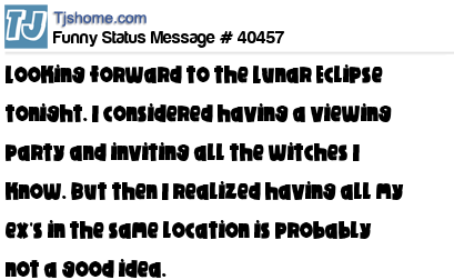 X is looking forward to the Lunar Eclipse tonight. I considered having a viewing party and inviting all the witches I know. But then I realized having all my ex's in the same location is probably not a good idea.