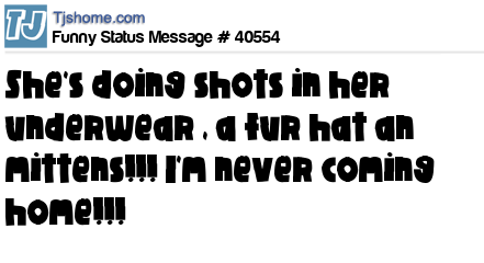 X is She's doing shots in her underwear , a fur hat an mittens!!! I'm never coming home!!!
