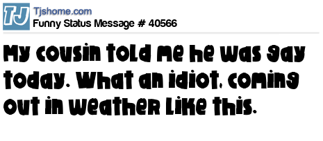 X My cousin told me he was gay today. What an idiot, coming out in weather like this.