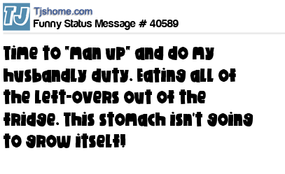 X Time to "man up" and do my husbandly duty. Eating all of the left-overs out of the fridge. This stomach isn't going to grow itself!