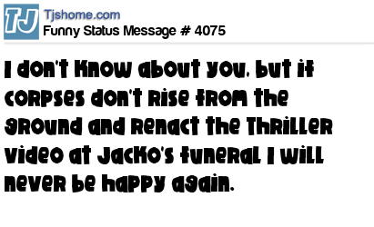 X says I don't know about you, but if corpses don't rise from the ground and renact the Thriller video at Jacko's funeral I will never be happy again.