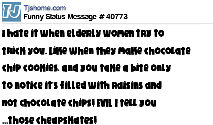 X I hate it when elderly women try to trick you. Like when they make chocolate chip cookies, and you take a bite only to notice it's filled with raisins and not chocolate chips! EVIL I tell you ...those cheapskates!