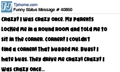 - # 78378 crazy? I was crazy once . . . my friends locked me in a padded room they said I was nuts . . . nuts? squirrels like nuts . . . squirrels are crazy! . . . crazy? I was crazy once . . . my friends locked me in a paddes room they said I was nuts . . .