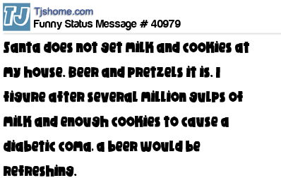 X is Santa does not get milk and cookies at my house. Beer and pretzels it is. I figure after several million gulps of milk and enough cookies to cause a diabetic coma, a beer would be refreshing.