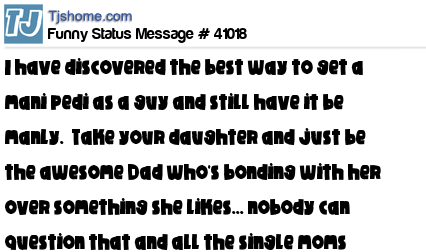 X says I have discovered the best way to get a mani pedi as a guy and still have it be manly. Take your daughter and just be the awesome Dad who's bonding with her over something she likes... nobody can question that and all the single moms just swoon. Bonus!