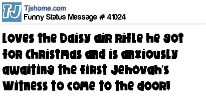 X loves the Daisy air rifle he got for Christmas and is anxiously awaiting the first Jehovah's Witness to come to the door!