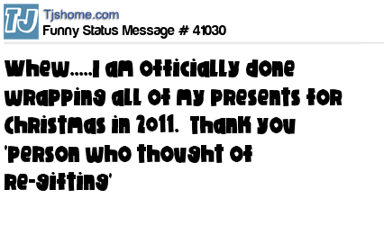 X is Whew.....I am officially done wrapping all of my presents for Christmas in 2011. Thank you 'person who thought of re-gifting'