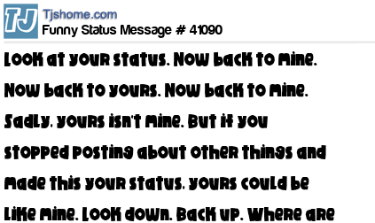 - # 28755 Look at your status, now back to mine, now back to yours, now back to mine. Sadly, yours isn't mine. But if you stopped posting about other things and made this your status, yours could be like mine. Look down, back up.Where are you? You're on Facebook, r