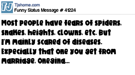 X Most people have fears of spiders, snakes, heights, clowns, etc. But I'm mainly scared of diseases. Expecially that one you get from marriage, Onegina...