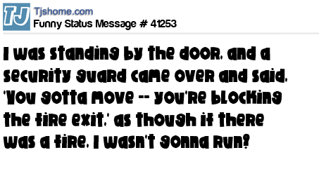 X is I was standing by the door, and a security guard came over and said, 'You gotta move -- you're blocking the fire exit,' as though if there was a fire, I wasn't gonna run?